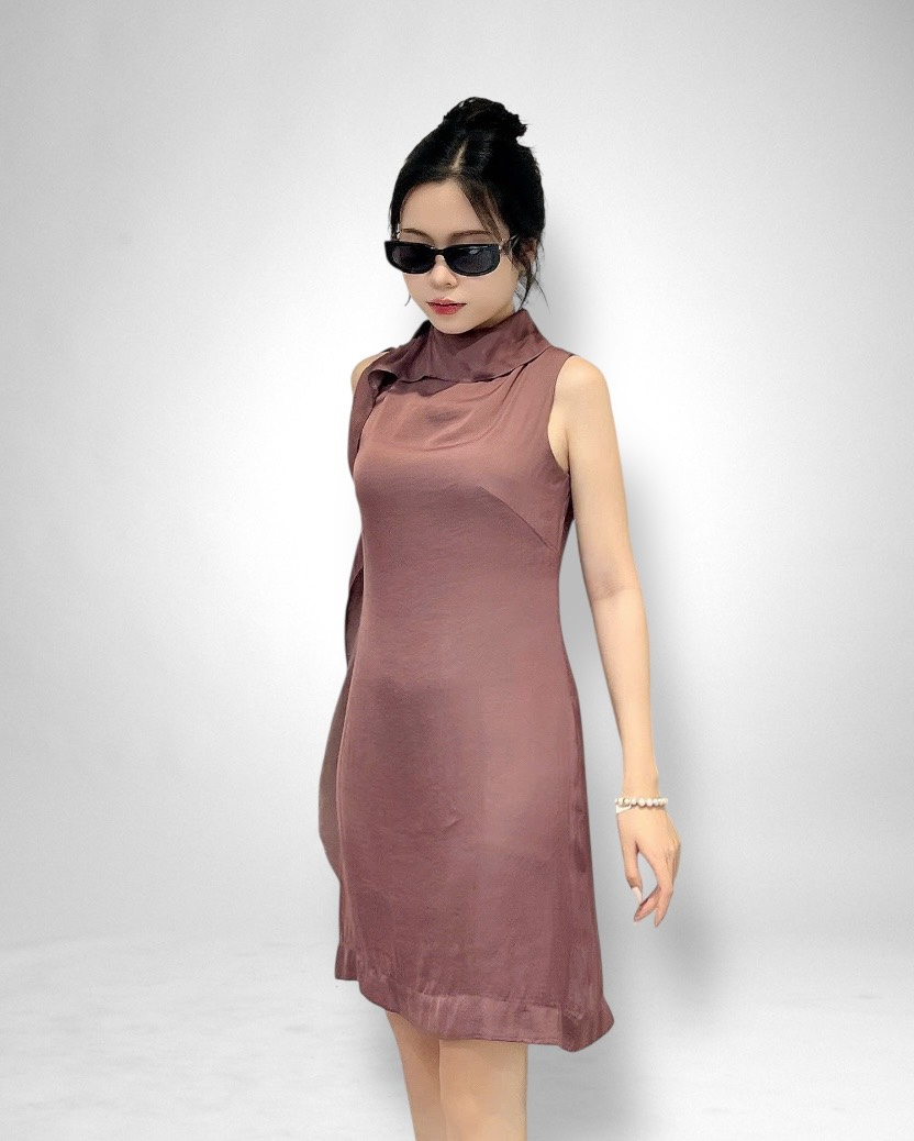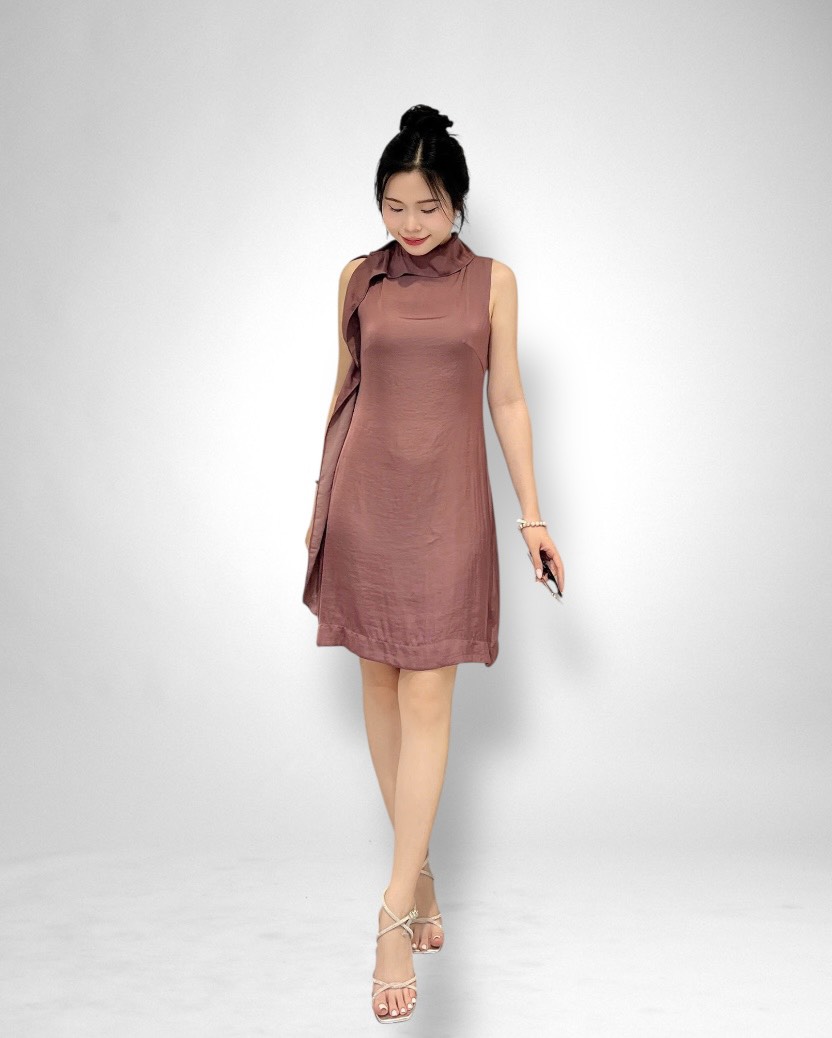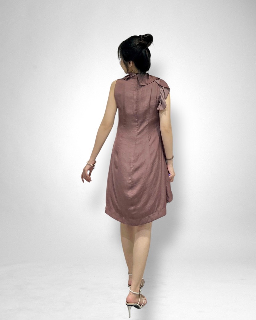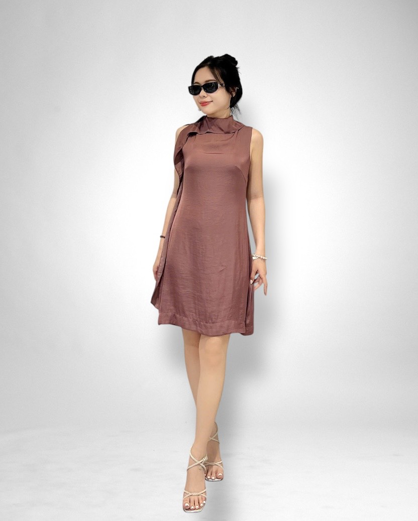 Thiết kế đầm suông thanh lịch, dài ngang gối, tôn dáng mà vẫn tạo sự thoải mái cho người mặc. Điểm nhấn độc đáo nằm ở đường bèo dún mềm mại chạy dọc từ cổ xuống một bên sườn, mang đến cảm giác uyển chuyển, duyên dáng trong từng bước đi.
