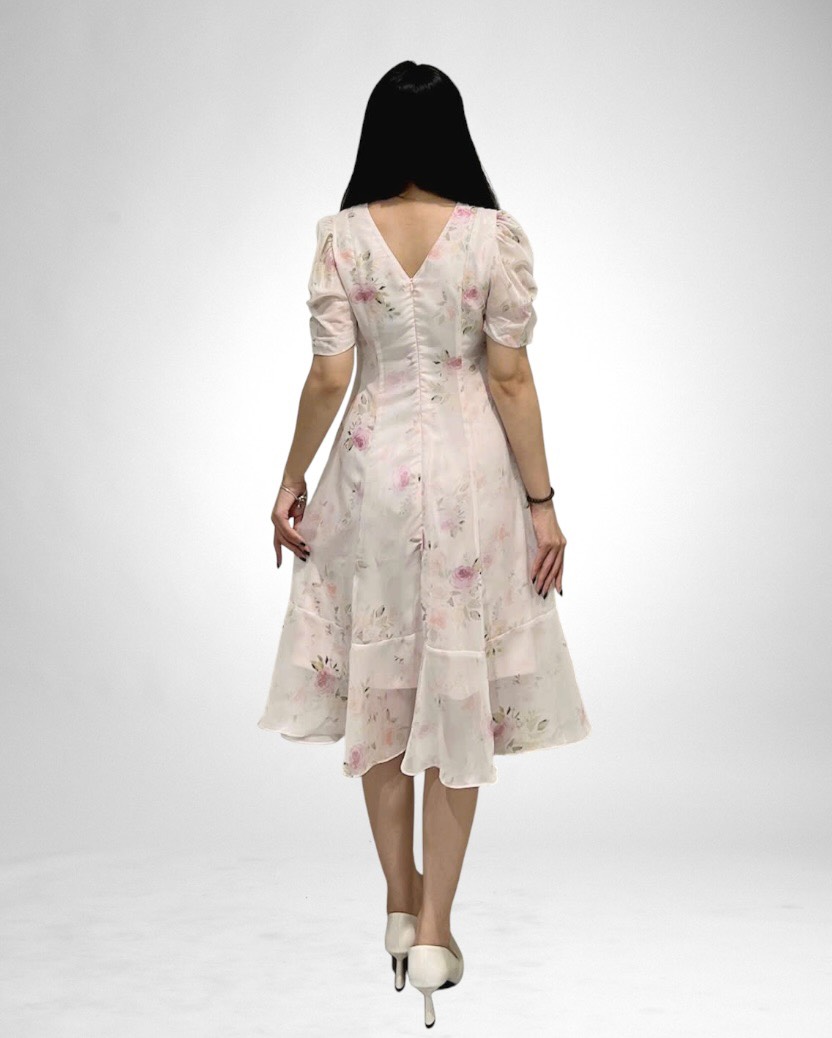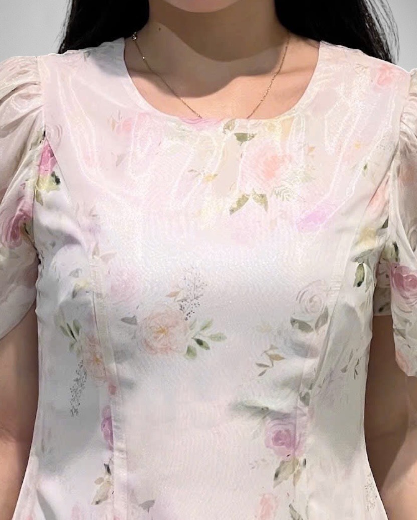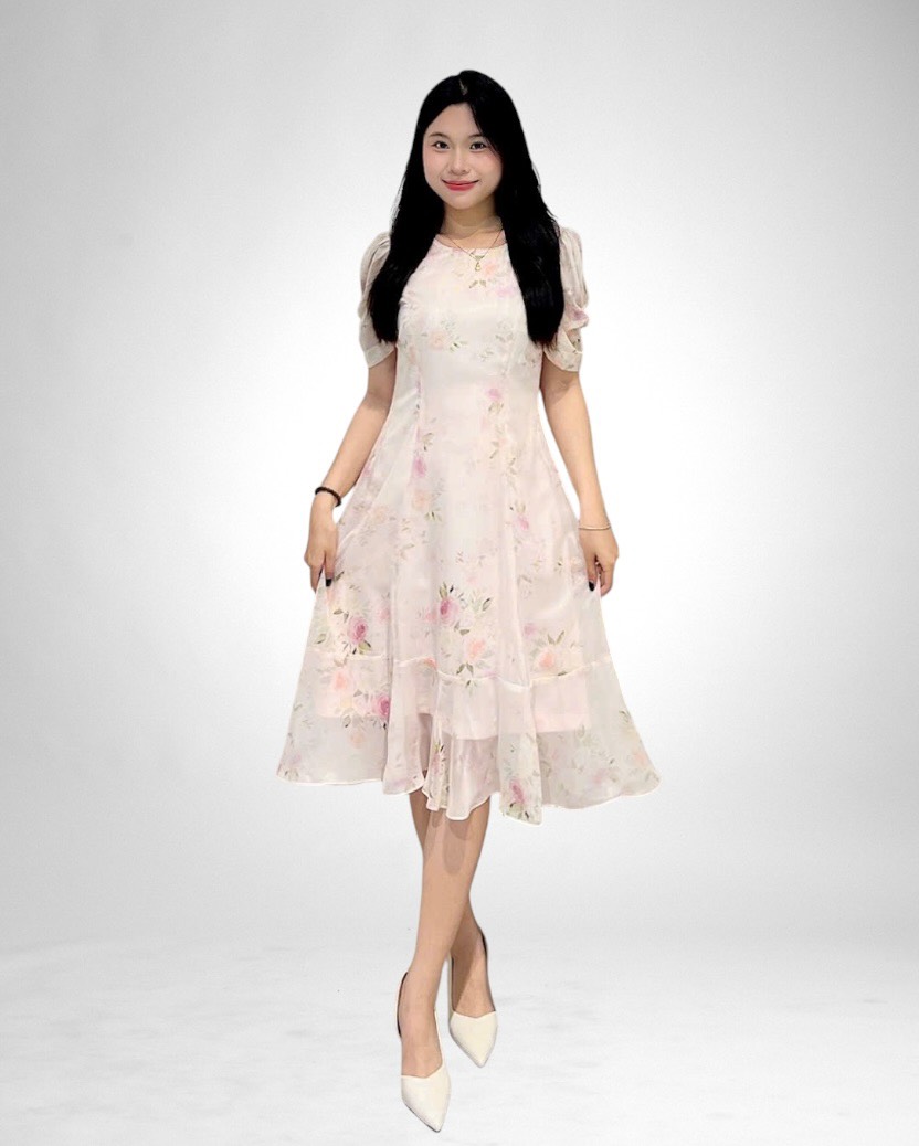 Thiết kế cổ tròn thanh thoát, kết hợp cùng tay phồng nhẹ tạo điểm nhấn nữ tính, giúp tổng thể vừa kín đáo vừa đáng yêu. Phần tùng xoè 6 mảnh được xử lý khéo léo, giúp váy có độ bung tự nhiên, mỗi chuyển động đều uyển chuyển và mềm mại.