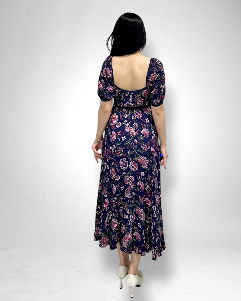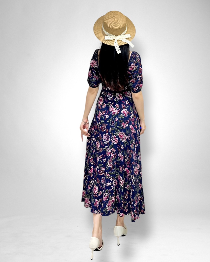 Chiếc đầm maxi mang vẻ đẹp nhẹ nhàng, nữ tính nhưng vẫn đầy cuốn hút. Thiết kế cổ vuông thanh lịch kết hợp tay ngắn giúp tôn lên phần cổ và vai một cách tinh tế. Điểm nhấn đặc biệt nằm ở phần cúp được cắt xéo mềm mại, tạo đường nét uyển chuyển, ôm vừa vặn mà vẫn thoải mái.