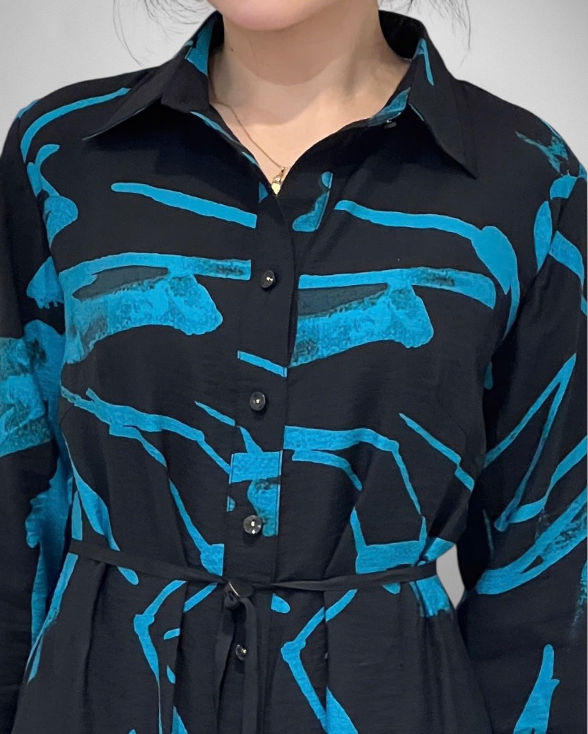 Chất liệu tơ sống cao cấp, mềm mại và thoáng mát, in nền đen hoa văn xanh nổi bật, tạo hiệu ứng thị giác đầy thu hút mà vẫn tinh tế. Phom rộng sang trọng, kết hợp dây cột eo màu đen giúp tôn lên vòng eo thon gọn, phù hợp với nàng yêu sự duyên dáng kín đáo mà vẫn muốn khoe nét nữ tính riêng.