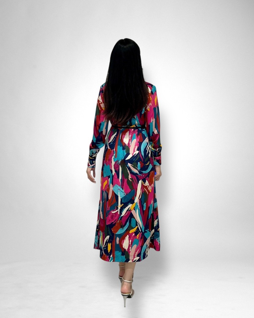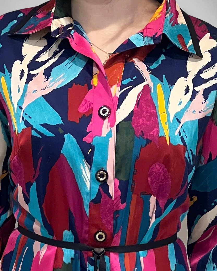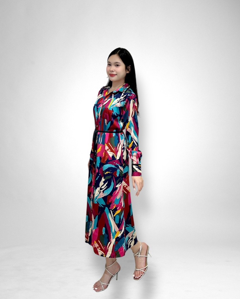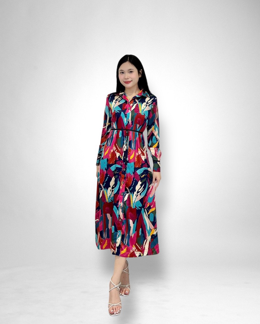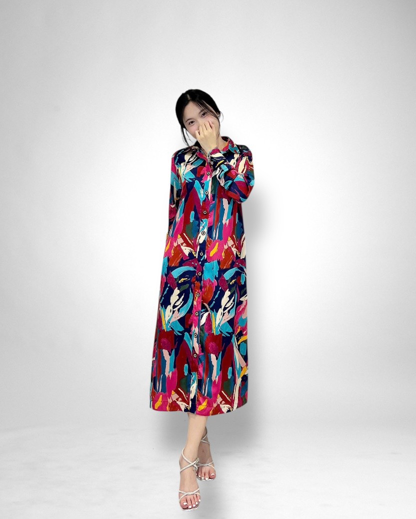 Đầm maxi dáng A với thiết kế bâu sơ mi cổ điển, tay dài thanh lịch và hàng nút cài trước tiện dụng, mang lại vẻ ngoài chỉn chu, hiện đại. Chất liệu lụa cao cấp in hoa văn lập thể nổi bật, tạo hiệu ứng thị giác độc đáo, giúp nàng thật nổi bật mà vẫn tinh tế.