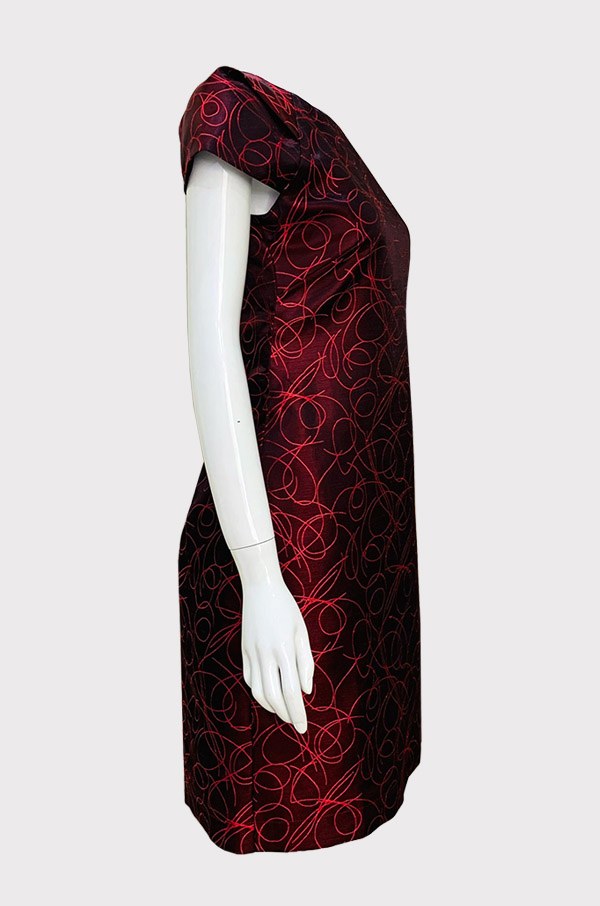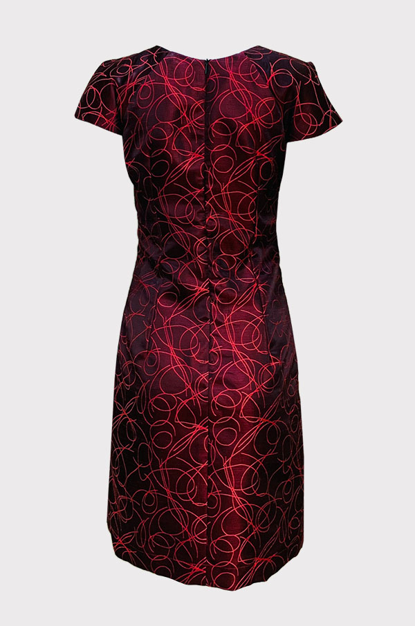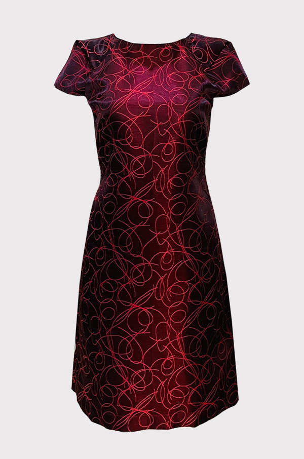 Kiểu dáng: đầm suông dài ngang gối, tay con, tone màu đỏ đô hoa văn xoắn ốc