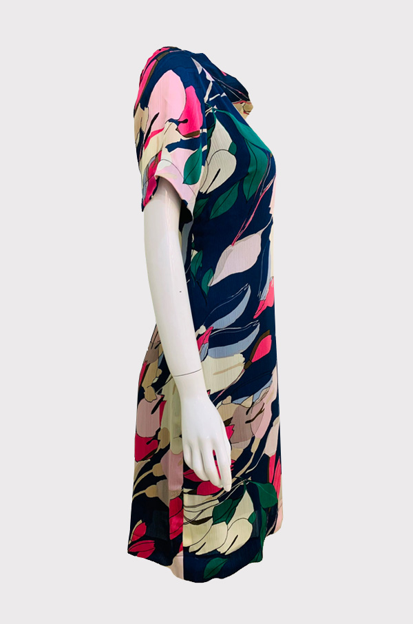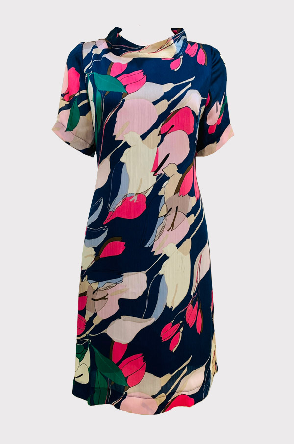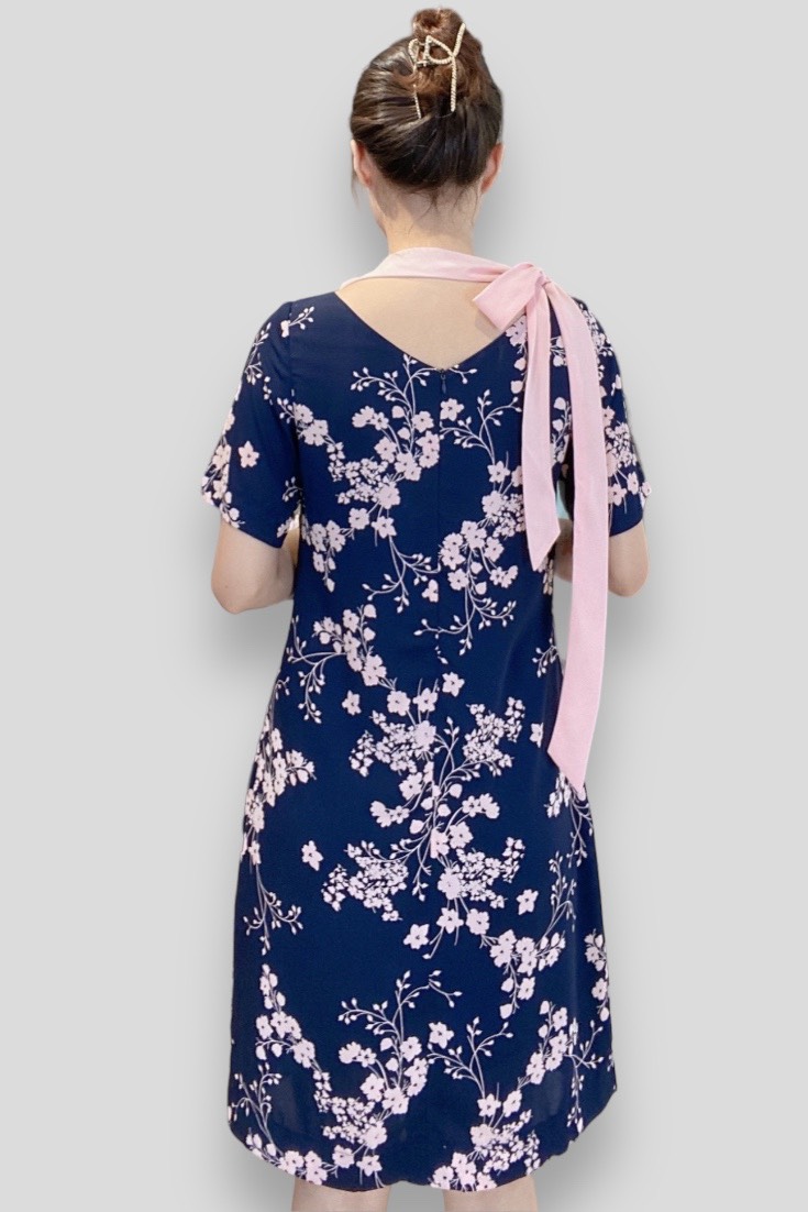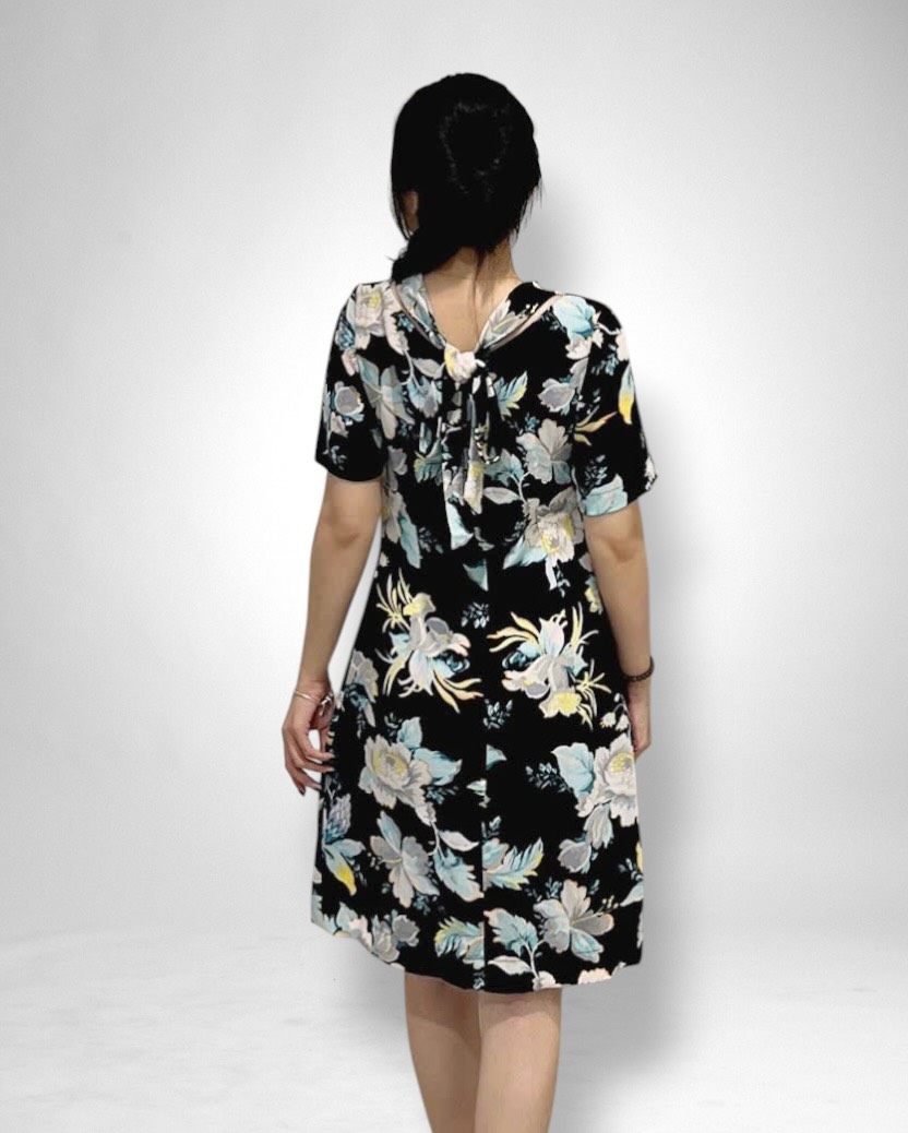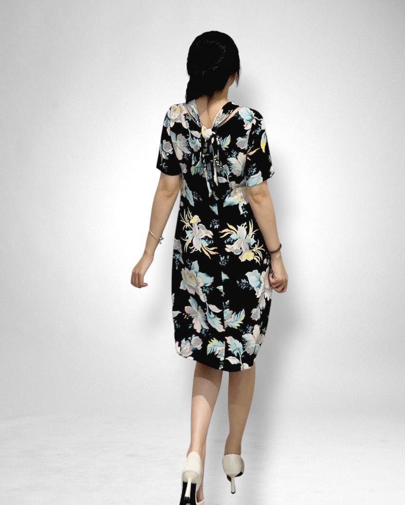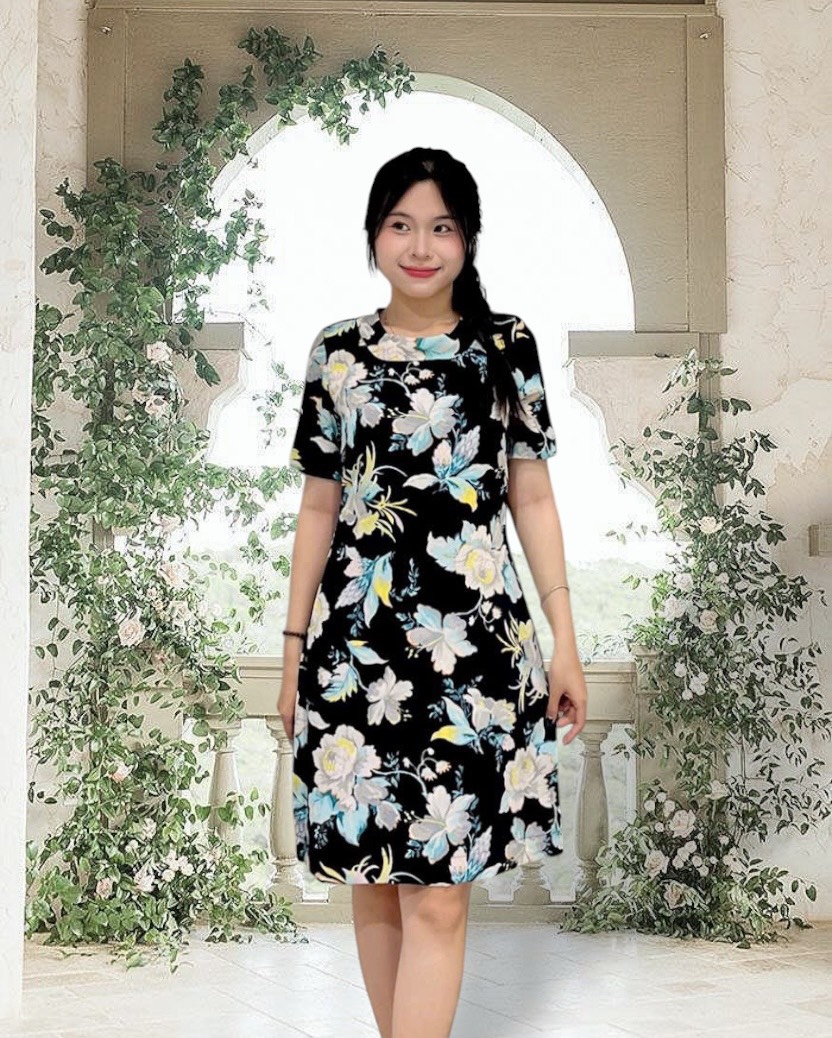 Chất liệu vải sô với nền xanh đen điểm hoa hồng nổi bật, vừa dịu mắt vừa sang trọng. Vải mát, nhẹ và ít nhăn, rất phù hợp cho những ngày bận rộn nhưng vẫn muốn giữ vẻ ngoài chỉn chu.