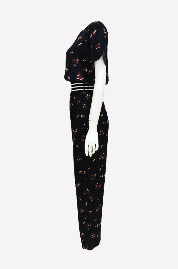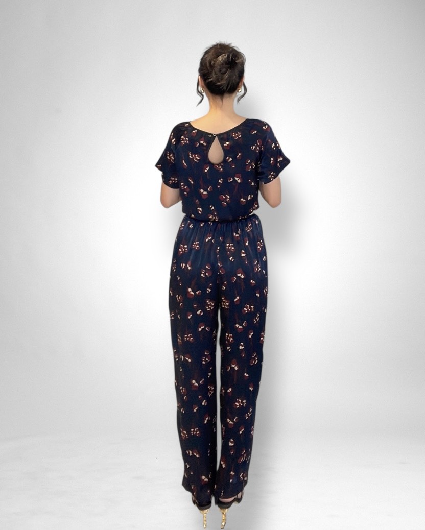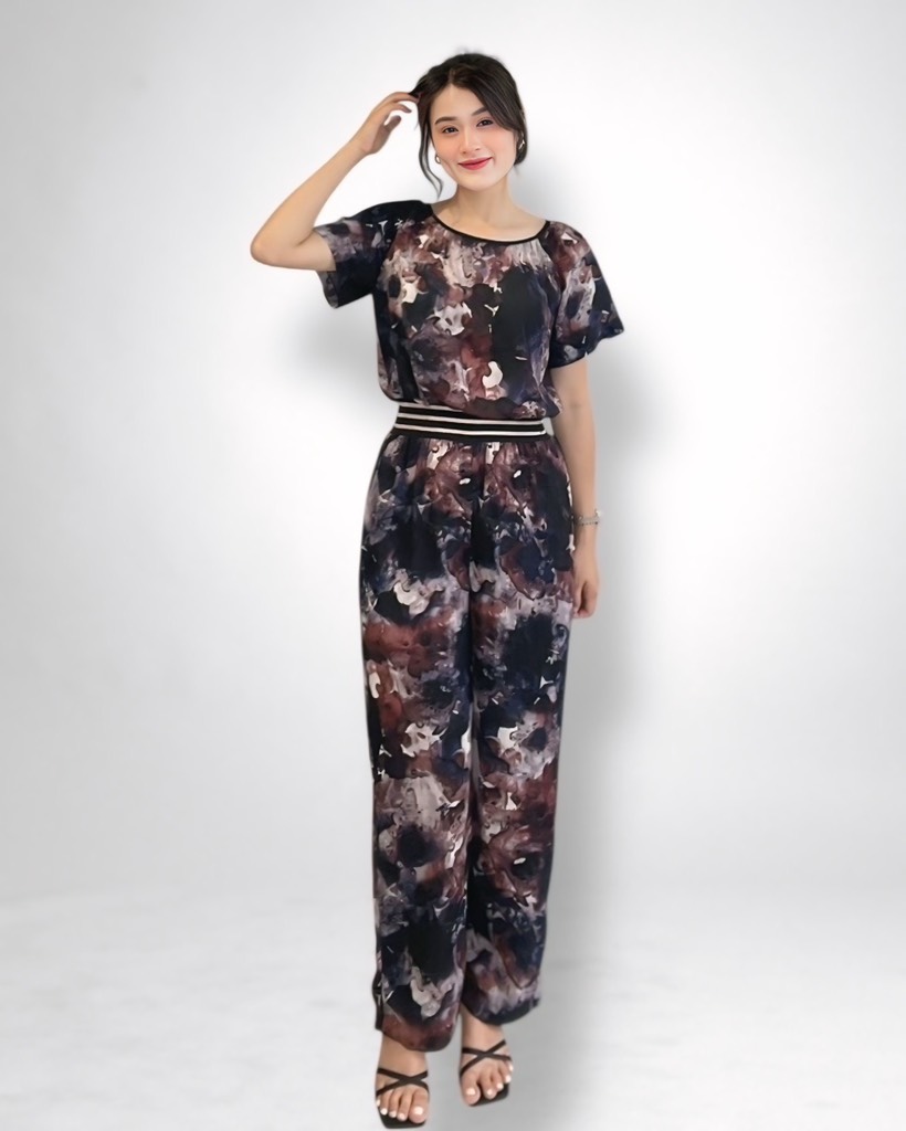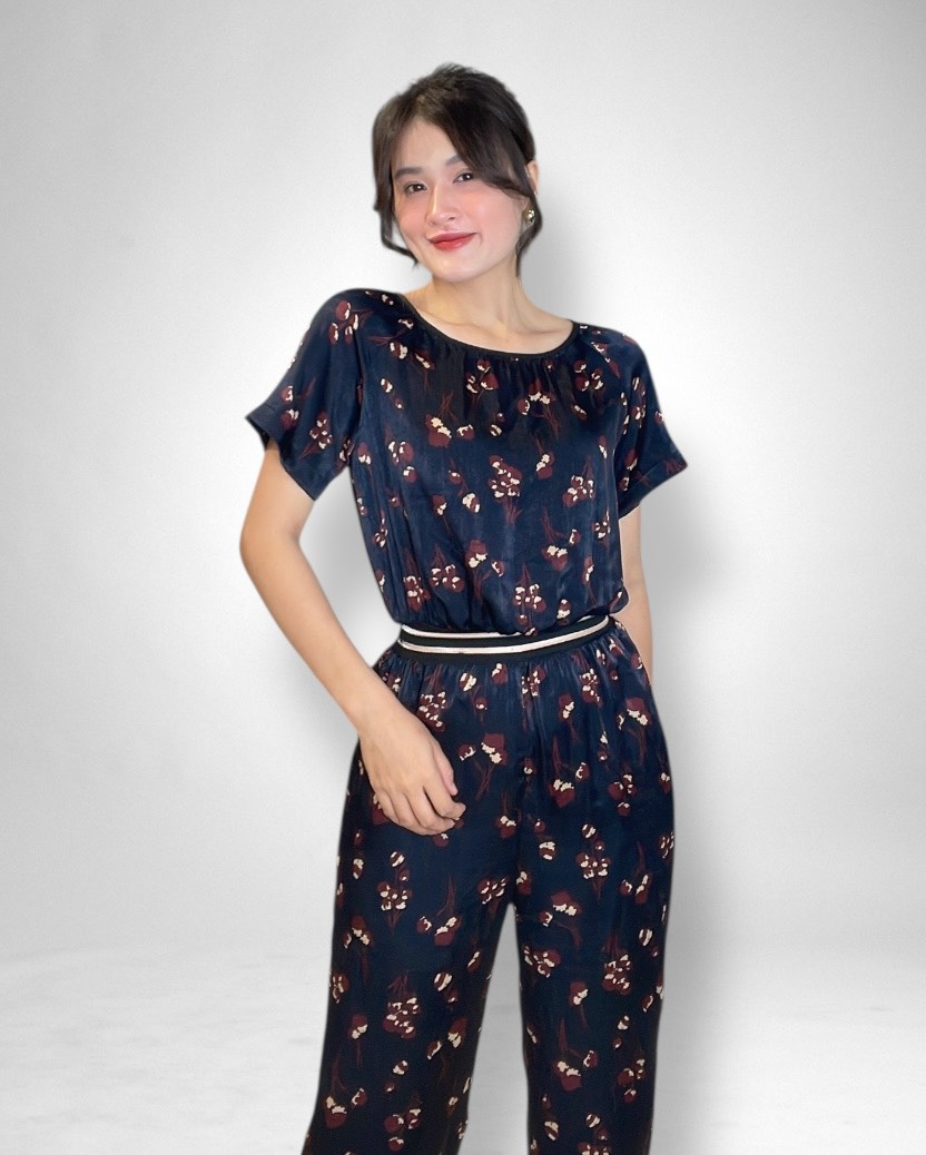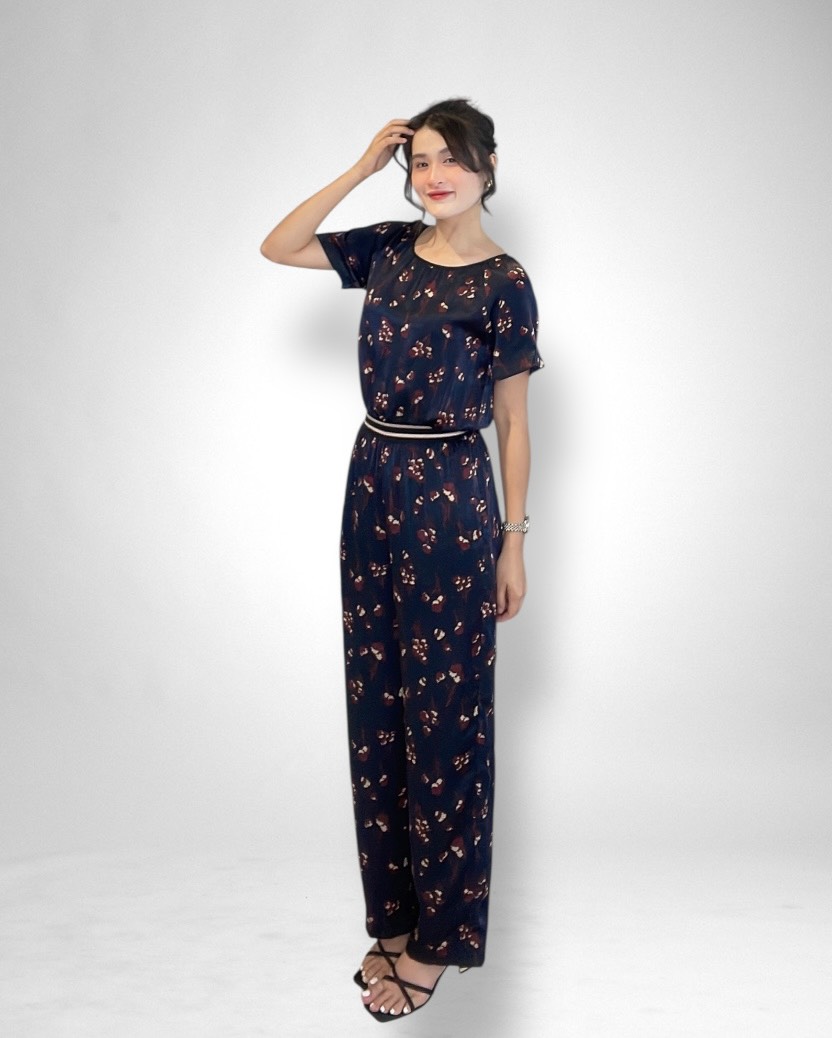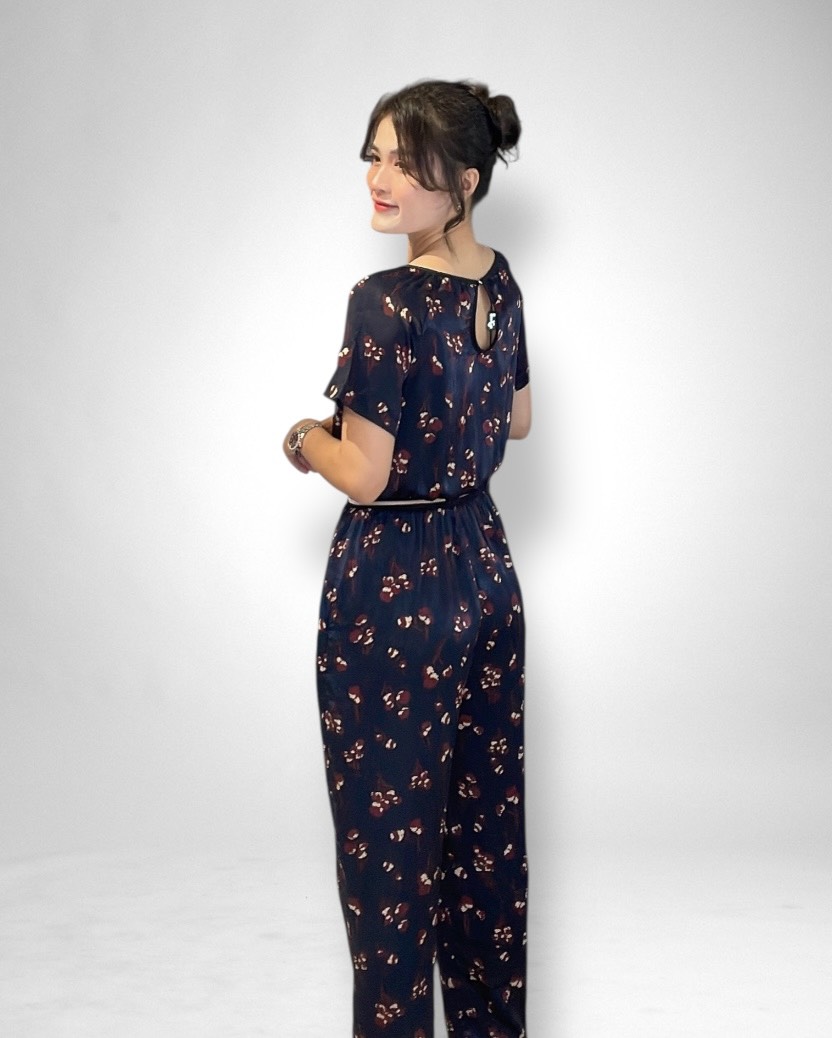 Bộ jumpsuit liền thân thiết kế sang trọng với phom dáng dài, chất liệu lụa cao cấp mềm mại, nhẹ nhàng ôm rũ theo đường nét cơ thể. Cổ thuyền thanh lịch, tay ngắn tạo cảm giác thoáng mát, phù hợp cho cả đi tiệc nhẹ hoặc dạo phố buổi tối.