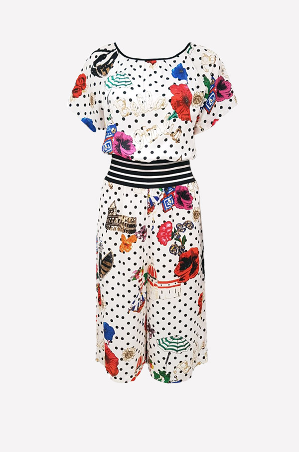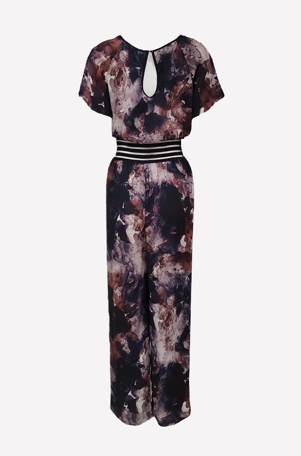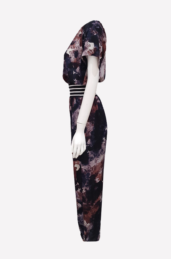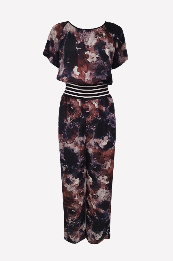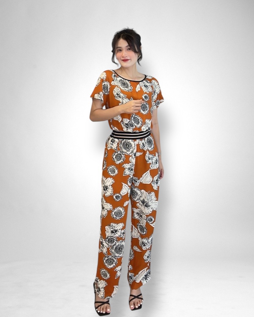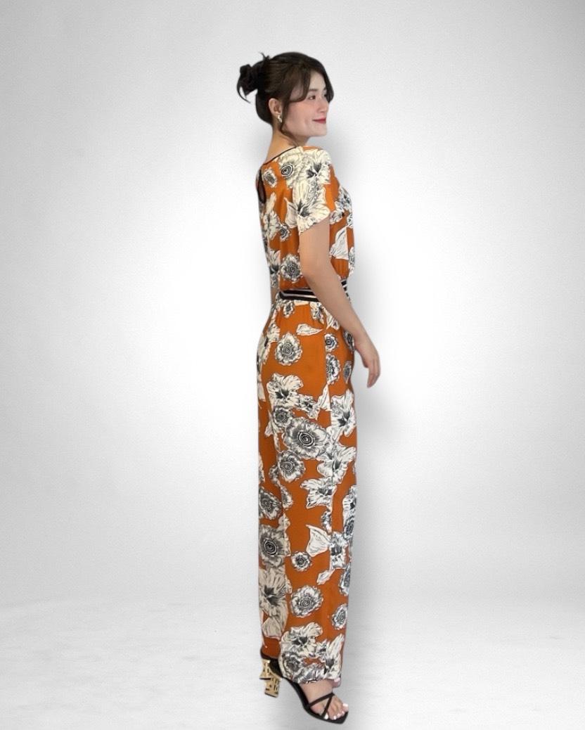 Bộ jumpsuit liền thân nổi bật với tông màu cam chủ đạo kết hợp họa tiết đen độc đáo, mang đến vẻ ngoài cá tính nhưng vẫn nữ tính và thời thượng.