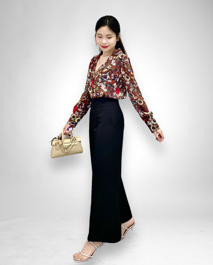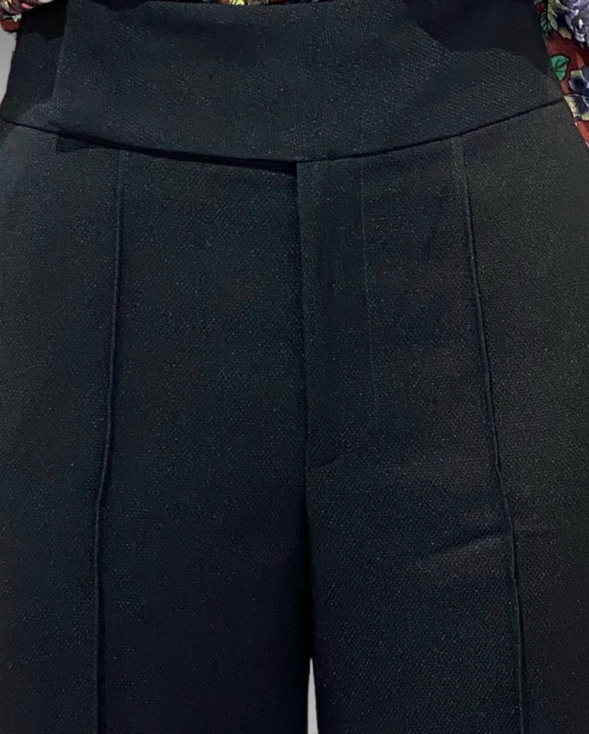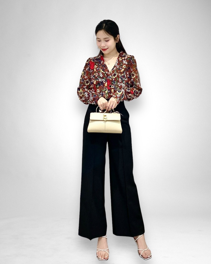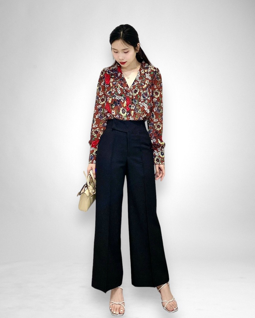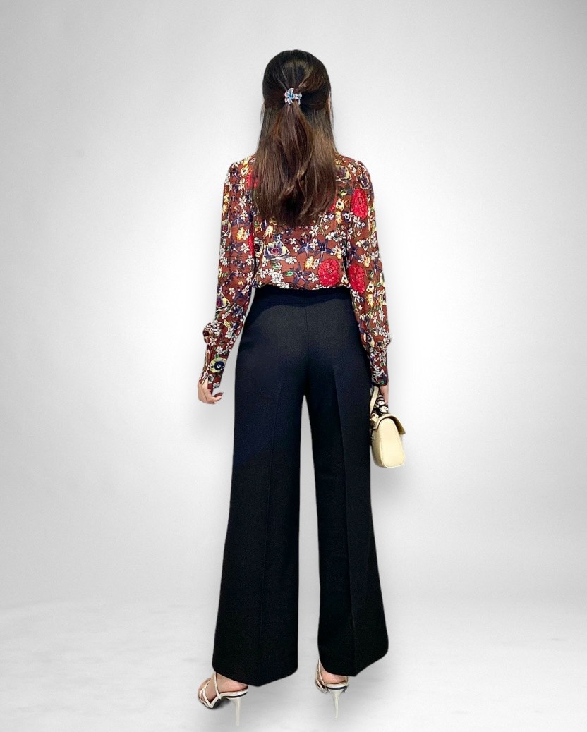 Phần lưng quần được thiết kế với bản móc chắc chắn, kết hợp với chi tiết dấu nút, giúp tạo sự vừa vặn và tôn dáng. Đặc biệt, kiểu dáng ống loe mang lại sự thoải mái và hiện đại, làm nổi bật phong cách thời trang cá tính. Chiếc quần này rất phù hợp cho những dịp đi làm, gặp gỡ bạn bè hay tham gia các sự kiện cần sự thanh lịch nhưng vẫn năng động.