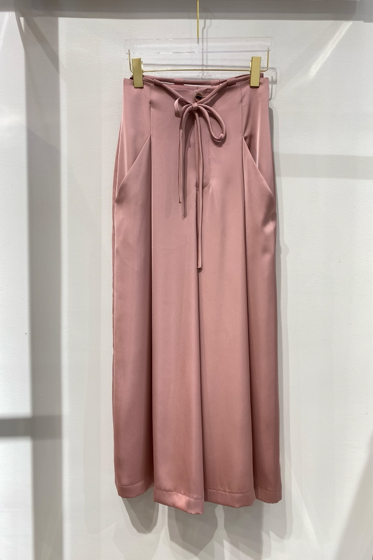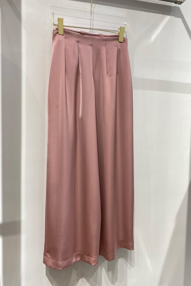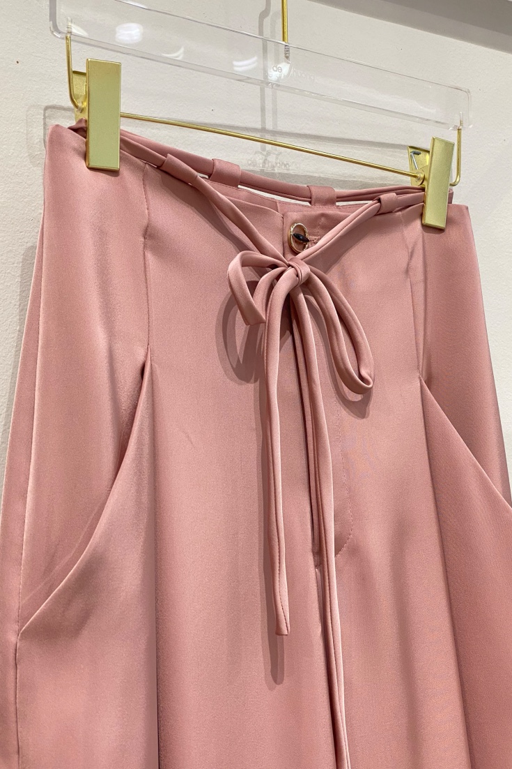 Chiếc quần có thiết kế ống rộng, mang đến vẻ ngoài thoải mái và thanh lịch. Chất liệu lụa hồng mềm mại, bóng mượt tạo nên sự sang trọng và quyến rũ, đồng thời cũng giúp người mặc cảm thấy dễ chịu và mát mẻ. Phần lưng quần được thiết kế với dây luồn màu hồng, có thể điều chỉnh vừa vặn với vòng eo, tạo sự chắc chắn và tôn dáng cho người mặc.